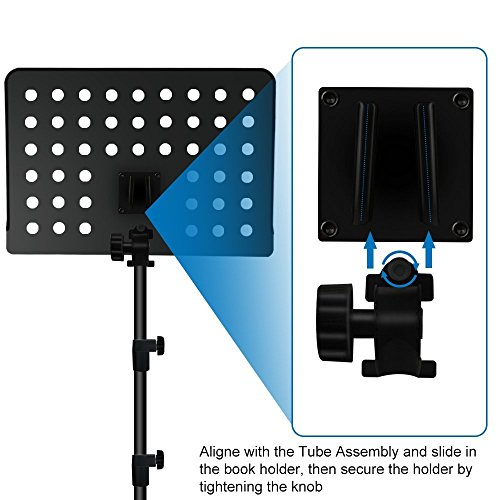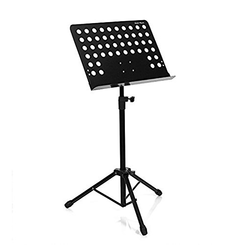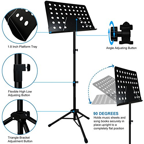 -. Feature : Bookplate measures 13.5" by 18.75" with 2" lip and rolled edges for safety and strength. / Height adjustment from 25" to 43" (lip to floor) for using while sitting or standing. Max. overall height is 55" / despite its heavy-duty material, it only weights 6 lbs. and the removable bookplate and collapsible tripod base for superior portability and easy storage. / there is no need to worry about the loading capacity of this conduct music stand with the sturdy metal tripod support legs, which have non-slip rubber caps at the bottom that secure at any height, even with a heavy load of music sheet. / Knobs, screw head, leg housing and leg end cups are all made of reinforced nylon material.