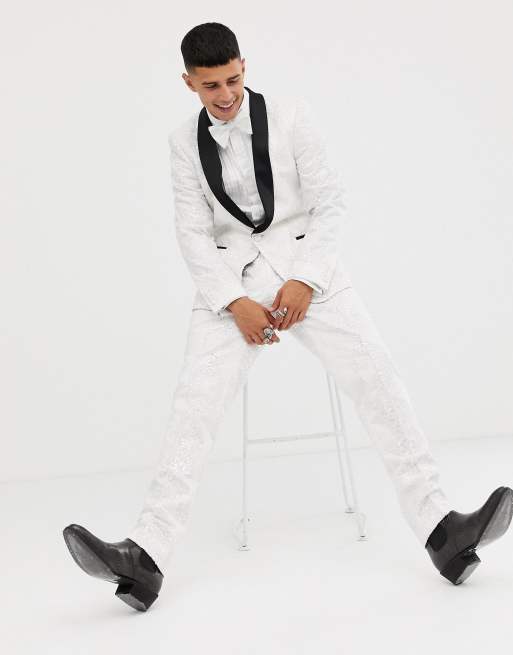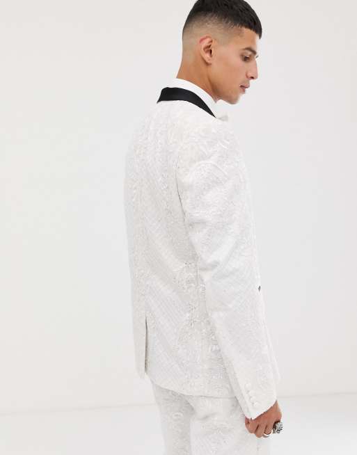ASOS EDITION skinny tuxedo suit jacket in sequin and lace embellished white sateen