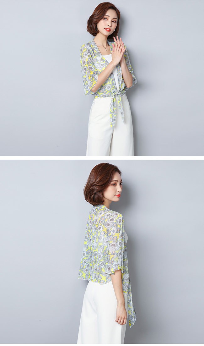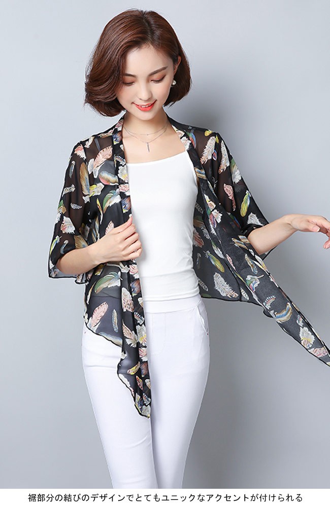 レディース用のボレロが登場 前開きボタン無しのタイプでカジュアル感たっぷり 裾部分の結びのデザインでとてもユニックなアクセントが付けられる 七分丈のベルスリーブは更に甘さとレトロ感が倍増 はっきりとしたプリント柄に滑らかな質感でとても上品で気質アップの一枚 普段着としてだけではなく、夏の日除けやクーラー対策にも最適なアイテム | |