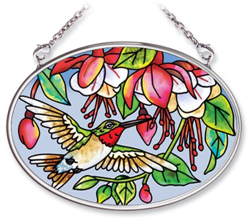 Amia 5670 Small Oval Suncatcher, Hummingbird and Fuchsia Design, 4-1/4-Inch W by 3-1/4-Inch L, Hand-painted Glass
