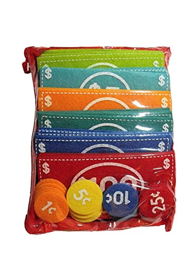 -. Feature : For ages Kindergarten and up / Set includes: 25 bills ($1-$100 denominations), 20 coins (1-25 cent denominations) & 1 zippered wallet/storage case / Use for counting & math, critical thinking, fine motor skills, & independent learning / All bills and coins are made of felt