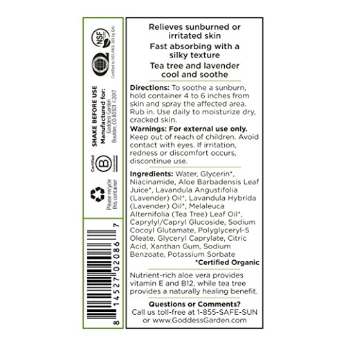 All the protective and healing power of aloe vera, without any sticky residue! Goddess Garden After-Sun Gel is a lightweight, air-powered spray gel. It is easy to apply and minimizes the need to rub delicate, sunburned skin. Organic aloe vera provides a healing and protective benefit that is ideal for sunburns, but also works well as a daily moisturizer to soothe dry or irritated skin. Lavender and tea tree essential oils cool and soothe sunburns on contact, while providing a light, fresh scent with no synthetic fragrances.Feature