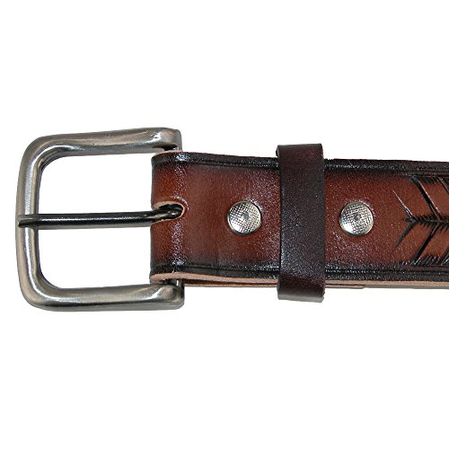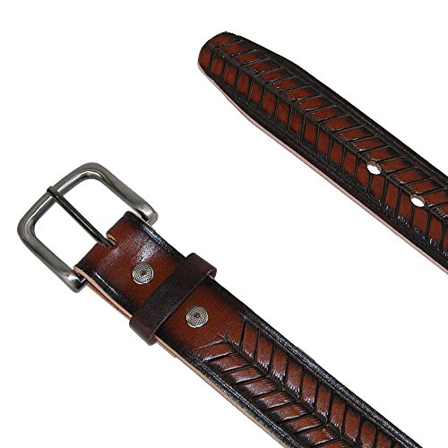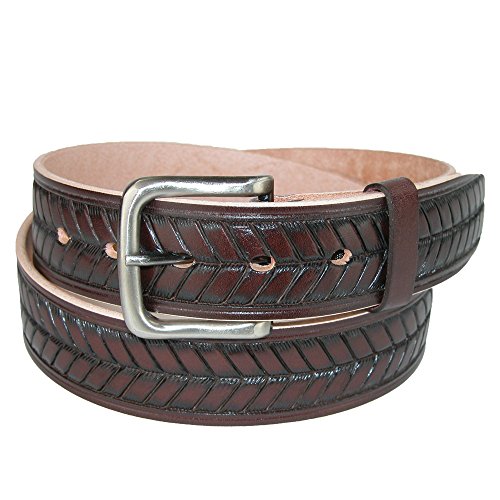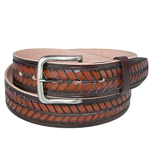 Studio : CTM Publisher : CTM Binding : Apparel Product Description Oil Tanned leather has a cut edge bridle style and is made out of one piece of leather. Embossed on the belt is an arrow or Basket weave type pattern. The buckle is removable so that you can use your own favorite buckle. For the best fit, please take your pant size and go up one (if you wear a size 34 or 35, order a 36 belt). 0