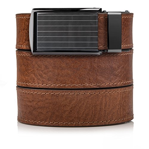 What is a SlideBelts brand ratchet belt? It's a leather belt that lets you freely adjust your belt size without the limitation of holes in the leather. In fact, there are no holes at all! A tab in the buckle catches on a row of notches sewn onto the underside of the leather, allowing for over 30 size options with 1/4" (6.35 mm) between adjustments. All SlideBelts come with a belt strap that can be trimmed to your exact waist size. The full length of one of our straps fits a 48" (122 cm) waist size. All buckles are completely removable and interchangeable with compatible SlideBelts products. Try SlideBelts out and see why there's no reason to poke holes in a perfectly good piece of leather.Feature
