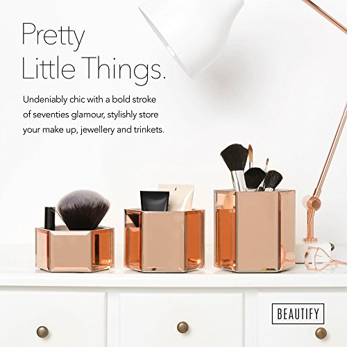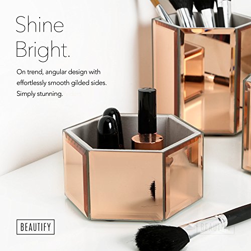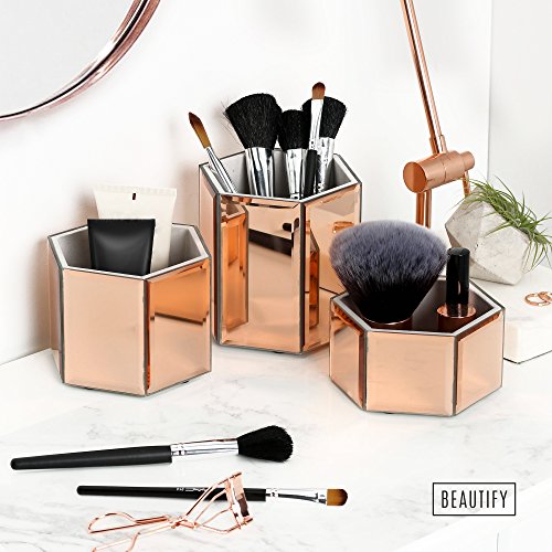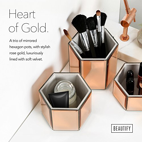 Beautify Hexagon Storage Pots for Makeup Cosmetics, Brushes, Jewelry & Accessories - Set of 3 with Glass Cleaning Cloth (Rose Gold)