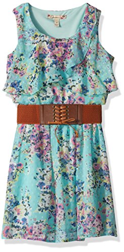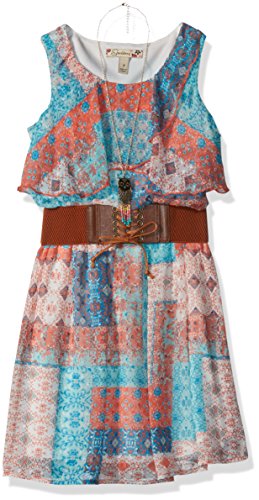 Sleeveless round neck knee length dress with a ruffle popover and wide belt