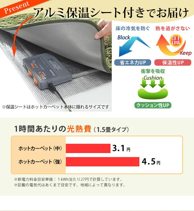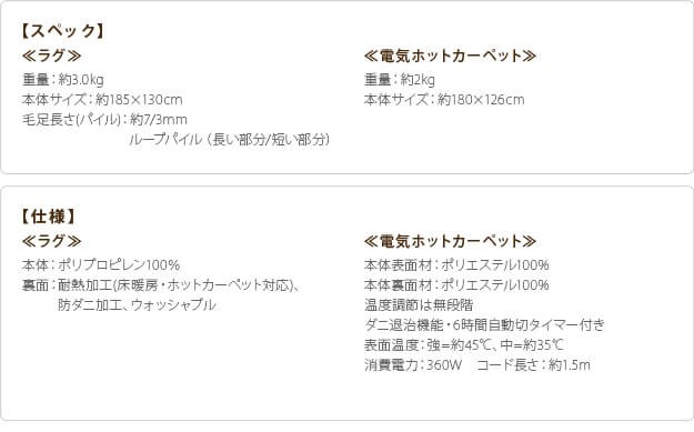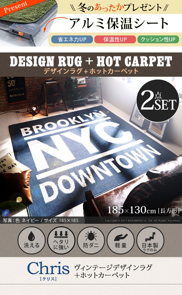 ※メーカー直送のため代金引換はお受けできません。※沖縄・一部離島は別途送料がかかります。お見積もりいたしますのでお問い合わせ下さい。【セット構成】カバーx1ホットカーペット本体x1【カラーバリエーション】グレー・ネイビー【仕様】■カバー本体:ポリプロピレン100%耐熱・防ダニ加工床暖房・ホットカーペット対応ウォッシャブル■ホットカーペット本体表面材:ポリエステル100%(タフト)裏面材:ポリエステル100%(フェルト)ダニ退治、6時間自動切タイマー付きアルミシート付き【サイズ】■カバー185x130cm重量:約3kg毛足長さ(ループパイル):7/3mm■ホットカーペット本体180x126cm・厚み6mm重量:約2kg株式会社ナカムラ(S33100208)