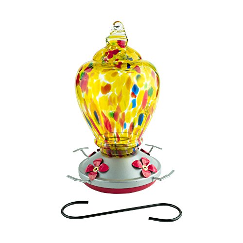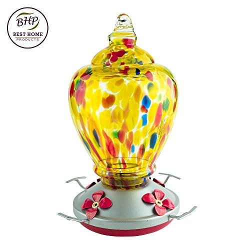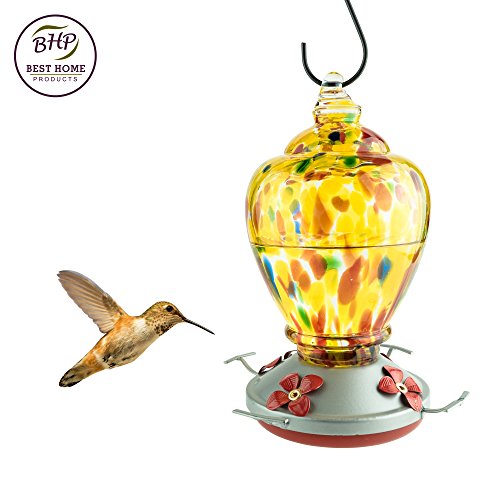 HUMMINGBIRD FEEDER with Perch --- Blown Glass | Autumn Impressions ORANGE & YELLOW| 28 ounces | Best Home Products