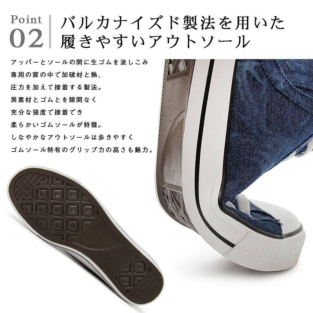 | 商品説明 | "カジュアルを格上げするデニムスニーカー" カジュアルの代名詞である、デニム素材を使ったハイカットスニーカー。 デニムパンツのコインポケットをモチーフにした側面部分がポイントで カジュアルな遊び心とデザイン性の高さを感じられる。 甲部分を低く設定し、履き口を細くしたスマートなフォルムで カジュアルでありながらも、洗練された雰囲気に仕上げた。 デニム素材はケミカルウオッシュを使用。 デニム素材に2次加工を施すという手間をかけることで、立体感のある表情に。 バルカナイズド製法を用いており、柔らかいゴムソールが特徴。 しなやかなアウトソールは歩きやすく、ゴムソール特有のグリップ力の高さも魅力。 ライニングやインソールにはコットン素材を用い、蒸れにくい仕様に。 |