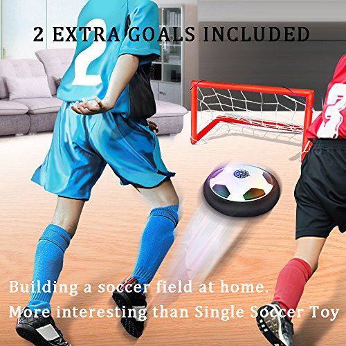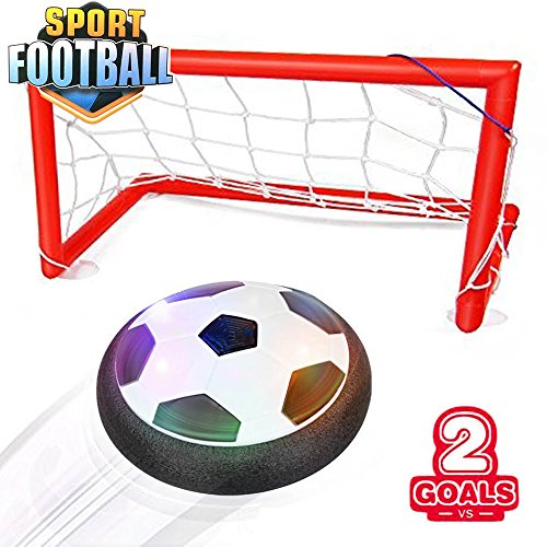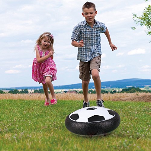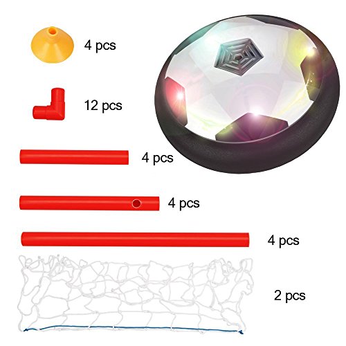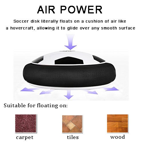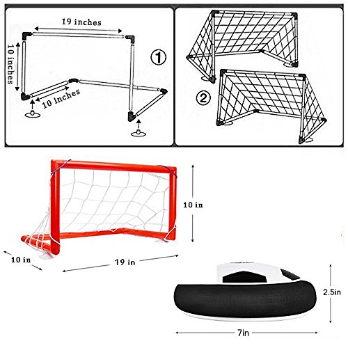[ECONOMICAL PACKAGE] Kids Air Power Soccer Disk Hover Ball Set with 2 Portable Goal The As Seen On TV Hover Ball is a fun addition for a home, classroom or community center. A specially designed shape allows it to glide across most flooring surfaces, even on carpet. The indoor Hover soccer ball is constructed with soft materials that will not damage furniture or walls. A textured top surface provides a sure grip on contact and gives it a realistic look. Easily keep your kids active, even when it is raining or snowing outside, with an engaging game inside. This As Seen on TV ball is easy to use and can provide hours of enjoyment and exercise for all ages. Main features: 1.Special soccer ball that floats like magic 2.Safe to play indoors 3.Will not scratch up floor surfaces 4.Does not damage walls or furniture 5.Use for games in the hallway or living room 6.Ideal for getting some active fun when it is raining or snowing outside 7.Vastly safer alternative to traditional soccer balls Specification: Recommended Age:1 - 15 years Color:Black White Material:Non-toxic plastic Package details: 1* Air soccer power soccer 2* Portable goals (Self assembly) How it works: 1.Set up the portable goal, there are diagrams on the color box. 2.Take the bottom panel apart from the disk, install 4 "AA" batteries(NOT INCLUDED)on the bottom of the disc then tighten the screws. 3.Flip the power switch, put it on a smooth surface and give it a little kick! You can kick it like a real soccer ball.