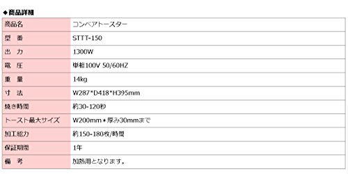 【상품명】 콘베이어토스터 【제품번호】 STTT-150 【출력】 1300W 【전압】 단상100V / 50-60HZ 【중량】 14kg 【치수】 W288*D418*H387mm 【구이 시간】약30-120초 【토스트 최대크기】폭200mm*두께30mm까지 【가공 능력】약150-180매/시간 【보증기간】1년 【비고】가열용 입니다.호텔,레스토랑,패스트푸드,카페,베이커리 숍,서비스 에어리어,catering,급식등 모든 후드 서비스에 이용 하실 수 있습니다. ○토스트 빵이 대량으로,구이 균일하게,맛있게 토스트에 옵니다. ○100V전원 를 위해,간편하게 도입으로 옵니다.토스트의 인출구를 앞과 뒷부분(터널식)의 2군데에서 선택할 수 있습니다. ○장소를 차지하지 않은 콤팩트 설계. ○올 스텐레스제에 내구성 발군. ○청소 편리.