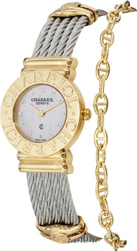 -. Feature : Polished stainless steel case yellow goldtone, Stainless steel chevron cable bracelet, Stainless steel caseback (screw-in), Bezel engraved with "Charriol" / Mother of pearl dial, Goldtone Hands, Twelve diamond hour markers, Additional goldtone steel chain connected to the bracelet / Sapphire crystal, Swiss quartz movement, Push/pull crown and a Jewelry clasp / Case measurements: 24 mm in diameter x 6 mm thick, Bracelet measurements: 15 mm wide x 7 inches long / Water resistant to 99 feet (3 ATM/30 meters)