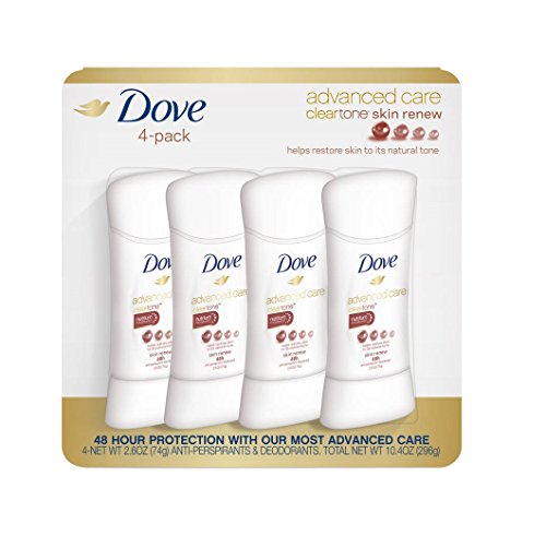 -. Binding : Health and Beauty -. Brand : Dove -. EAN : 0049008952188 -. Feature : Dove Advanced Care Antiperspirant Deodorant Clear Tone Skin Renew 2.6 oz, up to 48 hours of antiperspirant protection / 0% alcohol (ethanol) formula Contains Dove NutriumMoisture and ¼ moisturizers / Helps reduce dark marks on underarms and encourages the skin to replenish itself after shaving / Delicate floral fragrance -. IsAdultProduct : 0 -. Label : Dove -. Manufacturer : Dove -. Model : VBPUKPPAZIN2244 -. MPN : 938780 -. PackageQuantity : 1 -. PartNumber : 938780 -. ProductGroup : Health and Beauty -. ProductTypeName : HEALTH_PERSONAL_CARE -. Publisher : Dove -. Studio : Dove -. Title : Dove Advanced Care Antiperspirant, ClearTone Skin Renew 2.6 oz (4 Pack) -. UPC : 049008952188