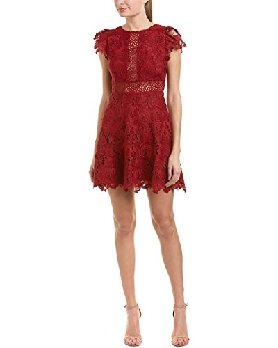 Scalloped lace mini dress with capped sleeves and lace detail on chest and waist. Lined. Back zip closure.