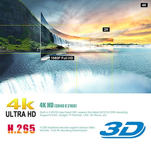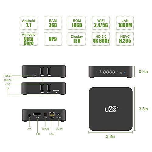Studio : U2C Publisher : U2C Binding : Electronics Product Description Android 7.1 Tv Box Hardware specification: O.S.:Android 7.1 CPU: Amlogic S912 Octa core ARM Cortex-A53 CPU @1.5GHz GPU: ARM Mali-T820MP3 GPU up to 750MHz RAM: 3G DDRIII ROM: 16G? eMMC DC In: DC 5V/2A USB Host: 3 High speed USB 2.0 port and 1 OTG port,support U disk and USB HDD TF Card Reader: Maximum Support: 128G(Micro SD Card) Lan: 1000M Gigabit RJ-45 Wifi:802.1.1 b/g/n? AC(2.4G 5.0G) Bluetooth: BT 4.1 AV In: AV(3 in 1) port SPDIF: Optical SPDIF interface Power Indicator: Power On/Off:Blue/Red LED Display: White light digital display,Show time and device connecting information(Wifi/BT,Lan,AV,HD,SPDIF) Decoder Formats: 4K, H.265, MPEG1/2/4, H.264, HD AVC/VC-1, RM/RMVB, Xvid/DivX3/4/5/6, Real Video 8/9/10 Video Formats: 4K@60fps, H.265, AVI, H.264, VC-1, MPEG-2, MPEG-4, DIVD/DIVX, Real8/9/10, RM,RMVB, PMP, FLV, MP4, M4V, VOB, WMV, 3GP, MKV Music Format: MP1, MP2, MP3, WMA, OGG, AAC, M4A, FLAC, APE, AMR, RA, WAV Photo Format: JPEG/BMP/GIF/PNG/TIFF DLNA: DLNA files sharing Languages: English/French/German/Spanish/Italian etc. 24 languages App Functions: Google play store,Amazon alexa,Netflix,Youtube,Facebook,Twitter,Online movies,etc Mouse/ Keyboard: Support mouse and keyboard via USB;Support 2.4GHz wireless mouse and keyboard via 2.4GHz USB dongle Other feature: Free Internet searching,many kinds of games,etc