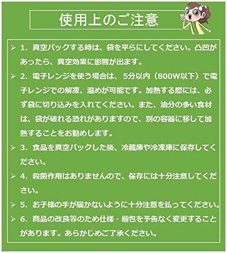 【주의사항】●진공 팩 하는 때는,대를 평평함등으로 하십시오.요철이 있으면,진공 효과로 영향이 나옵니다.●전자 레인지에 따뜻하게 경우는,5분간 이내(800W이하)나와 해동,따뜻하게가 가능하지만,반드시 봉투에 잘라 포함을 만들어 넣음(담는 그릇·상자 등) 공기의 출입을 자유로워 한 후,명등에 얹어 따뜻하게 하십시오.특히 유분이 많은 식재료는,대가 깨질 우려가 있기 때문에,충분히 주위를 기울이고 하십시오.●식품 등을 진공 팩 한 후,냉장고나 냉동고로 보존 해 하십시오.●본 상품은,살균 작용은 없기 때문에,보존에는 충분히 주의해 하십시오.●아드님이 손길이 미치지 않는 바와 같이(하도록) 충분히 주위를 기울이고 하십시오.●본 상품은,정전기 대응하고 있지 않습니다.●상품의 개량 등를 위해,사양 포장을 예고 없이 변경하는 일이 있습니다.미리 양해 바랍니다.