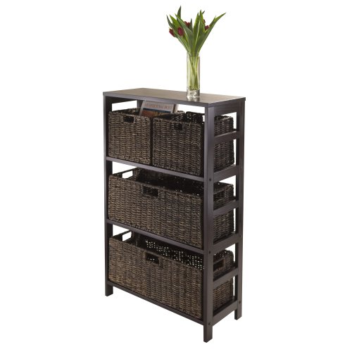 -. Feature : Overall dimensions: 25.20W x 11.22D x 42H in. / 6 baskets woven of corn husk / Rich espresso finish / Shelving unit crafted of solid and engineered wood / Baskets fold flat when not in use