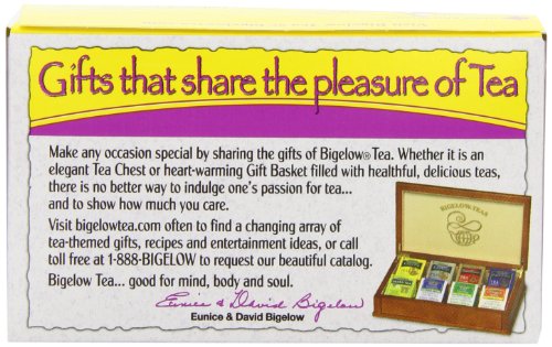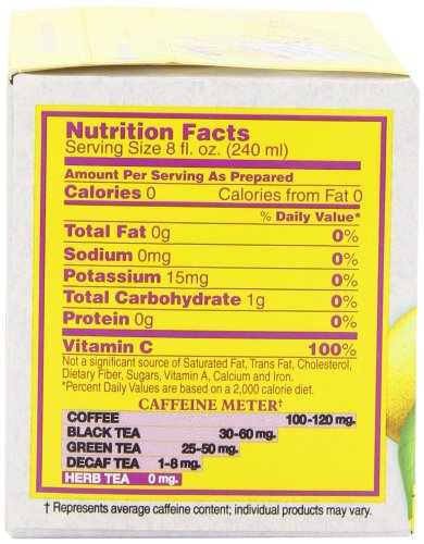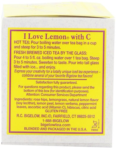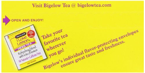 -. Binding : Grocery -. Brand : Bigelow Tea -. EAN : 0072310000520 -. Feature : Pack of six 20-count boxes of calorie-free herbal tea (120 total tea bags) / A herbal tea blended with rose hips, peppermint leaves, natural lemon flavors, and vitamin C / Caffeine-free and gluten-free, with no calories and no carbohydrates; Kosher Parve, 100% natural / This soothing herb tea relaxes and refreshes with all-natural flavors / Ships in Certified Frustration-Free Packaging -. Label : Bigelow -. LegalDisclaimer : Actual product packaging and materials may contain more and different information than what is shown on our website. We recommend that you do not rely solely on the information presented and that you always read labels, warnings, and directions before using or consuming a product. -. Manufacturer : Bigelow -. Model : 7231000052 -. MPN : 529047-00052 -. NumberOfItems : 6 -. PackageQuantity : 6 -. PartNumber : 529047-00052 -. ProductGroup : Grocery -. ProductTypeName : GROCERY -. Publisher : Bigelow -. ReleaseDate : 2006-06-22 -. Size : 6 Pack -. Studio : Bigelow -. Title : Bigelow I Love Lemon Herbal Tea, 20-Count Boxes (Pack of 6) -. UPC : 072310000520
