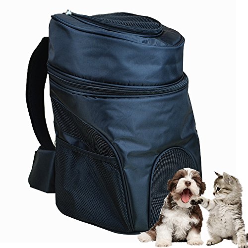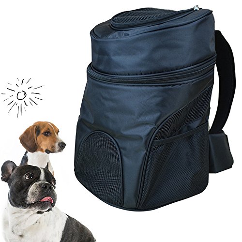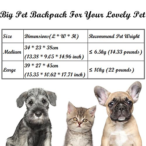 -. Feature : 1. High Quality Material Pet Backpack - Made of premium polyester material and EPE foam padding, soft- sided pet carrier is sturdy and washable. Easily carry in front or on back, keeping it safe and comfortable. It's fashionable pet carrier bag with specially designed for people who like to carry their lovely pets to the outdoors. Great for any outdoor venture, camping, hiking, walking the park and indoor events. / 2. Mesh Design for Ventilation & Visible, Mesh Pockets for Storage - Mesh window and top panel are designed for safety, ventilated and visible, making your pet breathe freely and relax. Zipped top entry allows for easy access. Mesh side pockets help store leash, whistle, water, snacks, treats and other necessities. / 3. Padding Panels & Removable Bottom Cover - With EPE foam padded back and sides, pup pack help your pet enjoy a nice nap. Removable bottom cover makes it easier to clean. Permeability is very good, easy admission, two-way zipper, easy disassembly, travel convenient. / 4. Airline Approved & Ideal for Outdoor Trips - Airline compliant dimensions for pets. It's great for sightseeing, camping or trips to the vet. Is your lovely pet tall and light, or small but heavy? Remember to measure its dimension firstly; a carrier should be a comfortable house for your adorable pet. / 5. Convenience and Comfortable Pet Carrier - Pet carrier is the perfect combination of convenience and style. Carrier belt over shoulders frees your hand while the pet rests in the pouch keeping it secure and comfortable. Carrier size: Medium: 13.38 x 9.05 x 14.96inch. Recommend Pet Weight: ≤ 14.33 lb; Large: 15.35 x 10.62 x 17.71inch. Recommend Pet Weight: ≤ 22 lb.