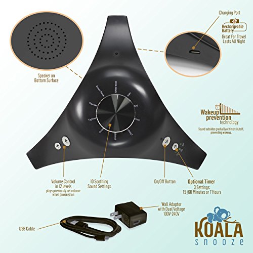 The Koala Snooze is equipped with a groundbreaking new feature called Wakeup Prevention TechnologyTM. Set the optional timer for 15min, 60min, or 7 hrs. When time is up, the sound will gradually fade into silence. This prevents sensitive sleepers from waking suddenly at an abrupt timer shut-off, as typically happens when using other sound machines.