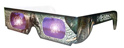 View an amazing new animal world! These holographic glasses create magical elephants that float around bright points of light! Slip these glasses on and get ready to be awed in wonder as you experience the mysterious phenomenon of bending light! While wearing these glasses, you can experience the light bending animal action by looking at street lights, city lights, fireworks or any bright, distant point of light! They also work great with holiday lights on houses and Christmas trees! These glasses feature two different animal images that can be put into action by moving the glasses up and down slightly. The American Paper Optics Wild Eyes Glasses set includes twelve different animals! Collect them all and bring the whole zoo home! Each set of glasses is colorfully designed on the front and includes easy to read instructions and animal facts on the back. These glasses are not intended for use over extended time, looking into the Sun, performing physical activity, driving vehicles, or operating machinery.