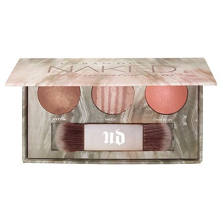 -. Feature : A trio of three shades in Urban Decay's coveted Naked Illuminated Shimmering Powder for Face and Body. / The Naked Illuminated Trio includes an exclusive double-ended brush to easily highlight from your cheekbones to your collarbone and beyond. Because the powders are baked, they provide a high level of ideal shimmer with the color payoff of a loose powder, the convenience of a pressed powder, and a silky finish. / 3 x 0.08 oz/ 2.36 mL Naked Illuminated Shimmering Powder for Face and Body in Pyrite (gold champagne), Oasis (marbled frosted taupe), Twilight (iridescent pink) / Double-ended brush