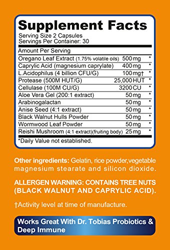 * Dr. Tobias CandidaFX is an effective support for your battle against candida. The product helps you detox and cleanse and may also help improve and maintain proper Candida levels in your body. Candida is a yeast fungus and occurs naturally in your intestines, in small amounts. However, due to the use of antibiotics, consumption of sugar, stress, or other dietary reasons, the amounts of candida can grow excessively and may affect your overall health and well-being. Our CandidaFX is made with herbs and will help you in all stages of your cleansing. Nature's time-proven ingredients like Oregano Leaf Extract, Wormwood Leaf Powder, Caprylic Acid, Oregano Oil, Protease, and Cellulase make it a very effective yet gentle cleanse.Feature