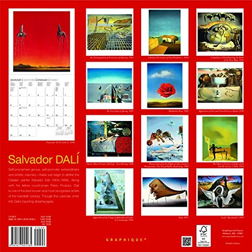 -. Binding : Calendar -. Brand : Graphique -. EAN : 9781477025185 -. Edition : 16m Wal -. Feature : Size: 12" x 12" format / Plan ahead with a 4-month preview page for 2018 / Each page includes before & after preview months / Includes public & culturally significant holidays / 4 languages: English, French, Spanish & Italian -. ISBN : 1477025189 -. Label : Graphique de France -. Manufacturer : Graphique de France -. Model : CY3417 -. MPN : CY3417 -. NumberOfItems : 1 -. PackageQuantity : 1 -. PartNumber : CY3417 -. ProductGroup : Office Product -. ProductTypeName : OFFICE_PRODUCTS -. PublicationDate : 2016-07-15 -. Publisher : Graphique de France -. Studio : Graphique de France -. Title : Graphique 2017 Dali 12" x 12", Wall Calendar (CY3417)