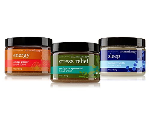 This is the greatest Aromatherapy Sugar Scrub set from Bath & Body Works. Melt your stress/tension away! Orange Ginger - ENERGY: Orange and Ginger Essential Oils are uplifting to release tension and sharpen the senses. Lavender Vanilla - SLEEP: Lavender Essential Oil and Vanilla Absolute help calm feelings of stress so you can sleep better. Eucalyptus Spearmint - STRESS RELIEF: Eucalyptus Essential Oil clears the mind while Spearmint Essential Oil uplifts. USAGE: Scoop out a handful of sugar scrub and massage gently over skin to exfoliate and cleanse.