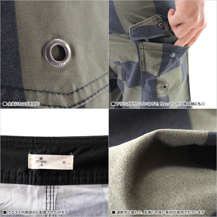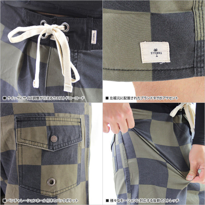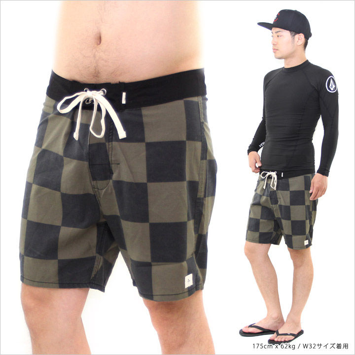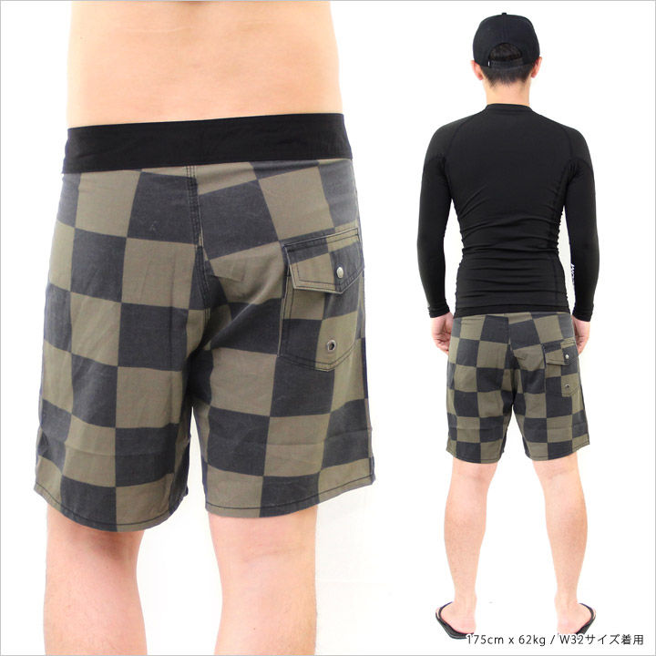 大きめのインパクトのあるチェッカー柄が海で好印象なサーフパンツ。カジュアルで合わせやすいカラーリングで、モノトーンからビビッドカラーのアイテムどちらとも相性は◎。また、アクティブで激しい動きにも対応できるストレッチ素材で、本格的なサーフパンツとしても着用できる実用性の高さも見逃せない一着です。