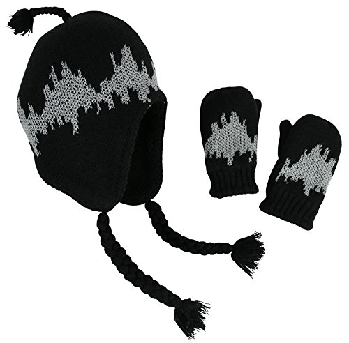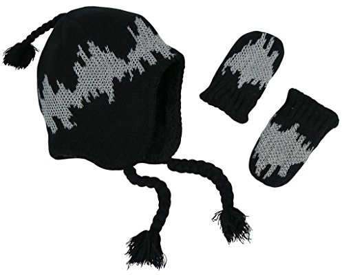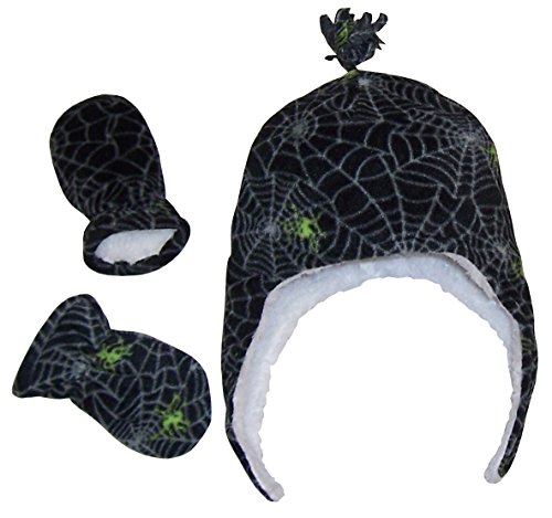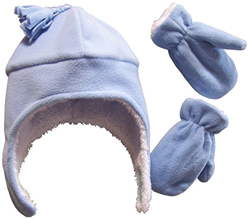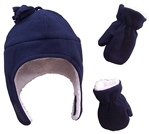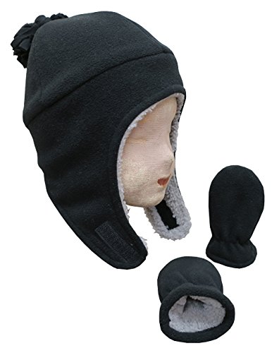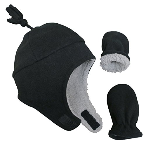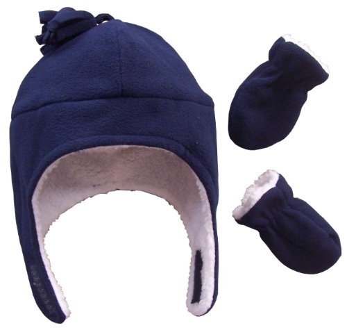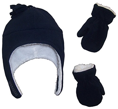 Binding : Apparel Product Description N'Ice Caps TM boys soft sherpa lined micro fleece pilot style hat and mitten set. Material is very soft for warmth and comfort. Product features include velcro chin strap on hat, hanging tassels, elastic on mitten wrist. 5 colors available: Black, navy, royal, charcoal grey, red, light blue. 4 sizes available: One size fits 3-6 months; one size fits 6-18 months; one size fits 2-3 years; one size fits 4-7 years. For infant sizes 3-6 months and 6-18 months, the mittens do not have thumbs. For larger sizes 2-3 years and 4-7 years, the mittens have thumbs. Not all colors available in all sizes. Tested and approved as per CPSIA standards. 0