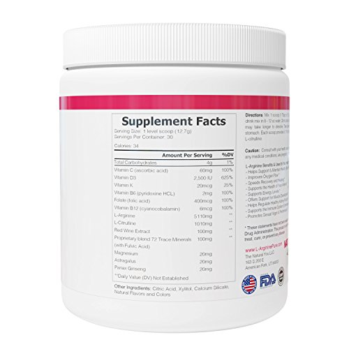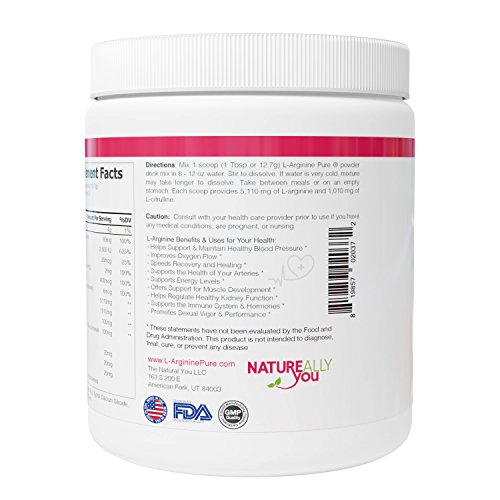 Studio : NATUREALLY YOU Publisher : NATUREALLY YOU Binding : Health and Beauty Product Description L-arginine PURE® Cardio Health Nitric Oxide Booster BY NATUREALLY YOU. L-arginine PURE®, Cardio Health Formula: Powder Supplement contains 5110mg L-arginine, 1010mg L-citrulline, as well as Vitamin B6, Vitamin B12, Vitamin D3, Vitamin C, Xylitol, Red Wine Extract and 72 trace minerals per serving. L-arginine PURE® is the most EFFECTIVE L-Arginine product on the Market! Give us a couple of weeks and you'll be surprised...and so may your doctor! L-arginine PURE can be used to get support for your blood pressure, choelsterol, heart health while also helping to improve blood flow and increasing your energy. 0