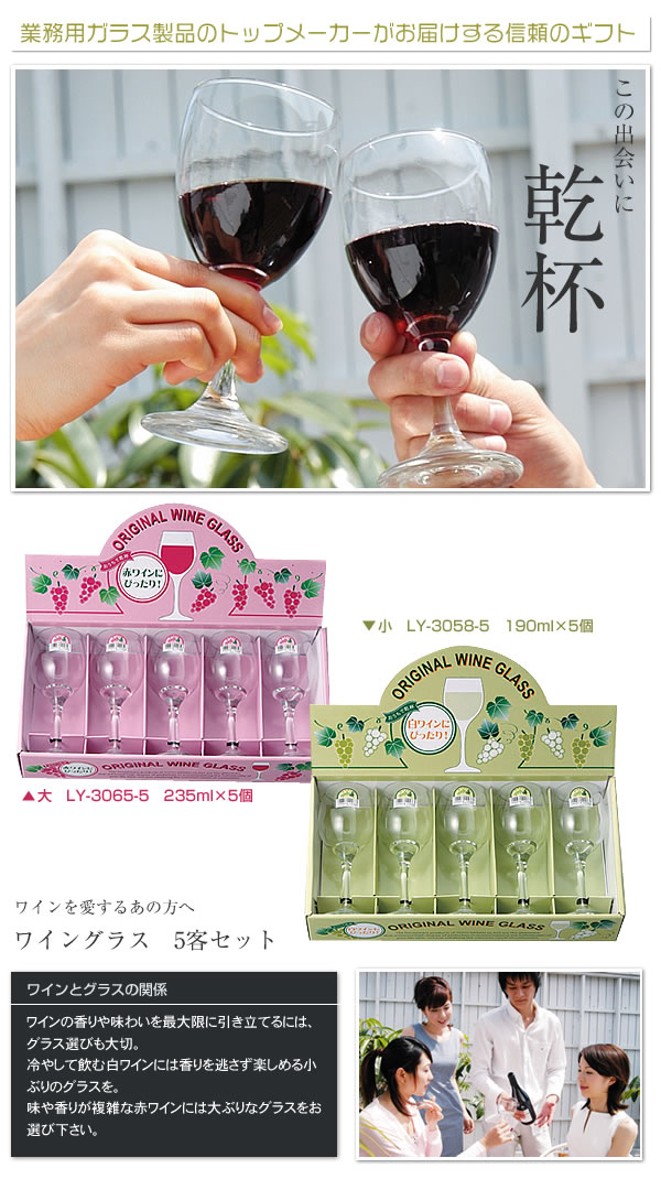 | セット内容 | LY-3065-5:ワイングラス(大)×5 LY-3058-5:ワイングラス(小)×5 |