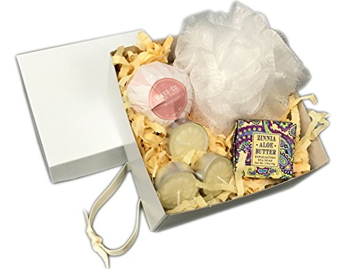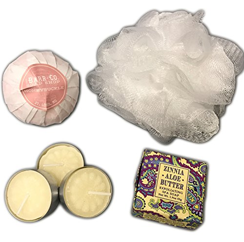 Spa for a Day Bath in a Gift Box Set Includes Barr Bath Bomb, Bath Pouf, Specialty Soap and Aromatherapy Candles (Honeysuckle)