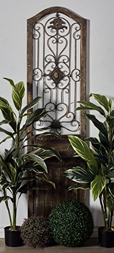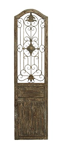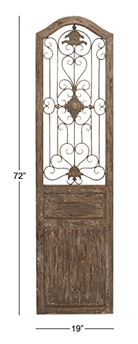 Important Features: _Made of wood and metal _Size: 19"x1"x72" This door is made with a unique garden gate styled floral center and scrolling ironwork that meanders out from it. The plaque is made into the shape of an old fairy tale style door, adding a beautiful and rustic quality anywhere you hang it. Ideally hung in a beautiful backyard garden or patio for a fairy tale escape.Feature