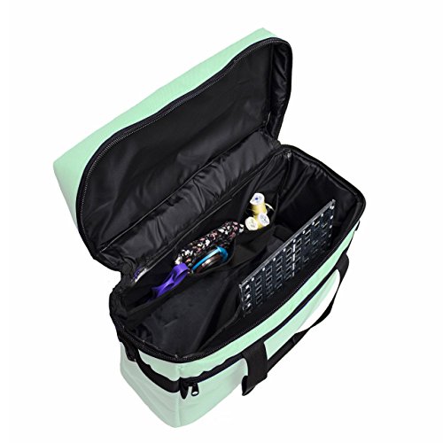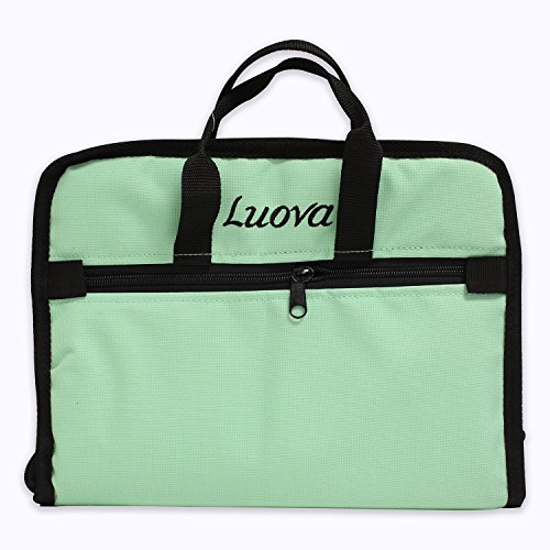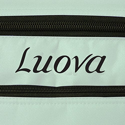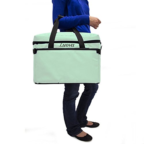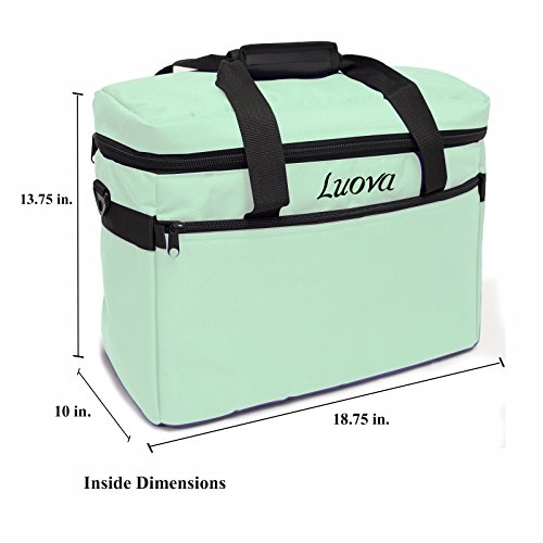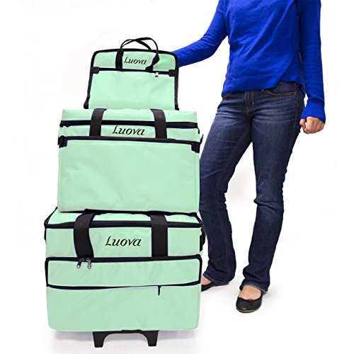 -. Feature : Luova, meaning "to create," is the theme of our new line of sewing and crafting lage that you will enjoy for years to come. Whether you are going across town or across the country, the durable yet affordable Luova lage will protect your machine on the way. / The Luova 19" Rolling Sewing Machine Trolley in Mint Green features a red, ball bearing extended-height wheel set and a telescoping, lockable comfort-grip handle for easy maneuverability. / The Luova 18" Sewing Machine Tote in Mint Green is great to transport a smaller, standard size machine or to use as a project bag when visiting your sewing buddies. The Luova 18" Sewing Machine Tote features a zippered front pocket and four internal pockets to keep all of your supplies organized. / The Luova Notions Bag in Mint Green is great for all of your smaller sewing and crafting supplies. The Luova Notions Bag has seven separate zippered storage sections. The Luova Notions Bag is made from the same quality materials as the larger Luova bags, for years of organized use. / *Machine and accessories shown not included