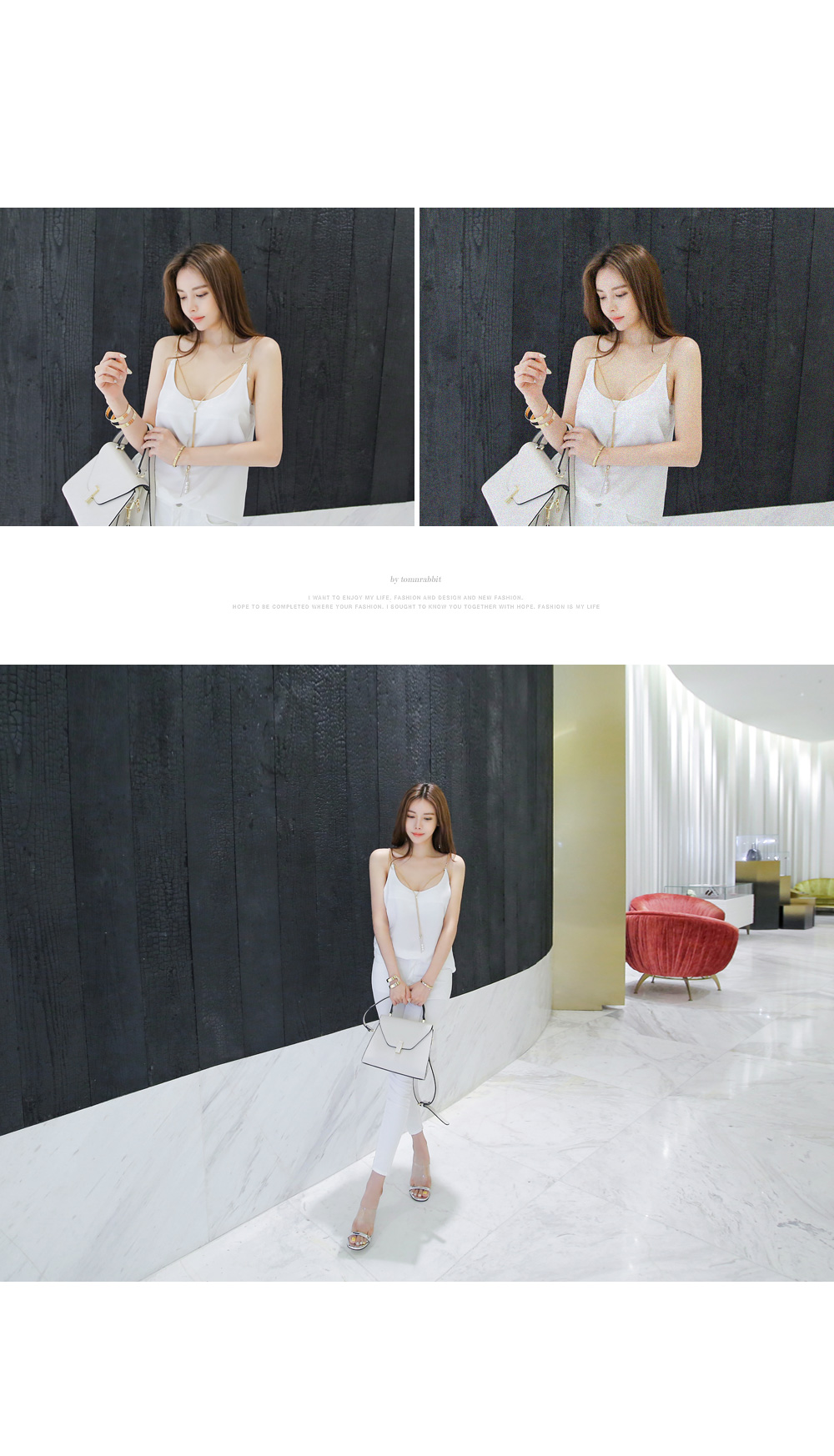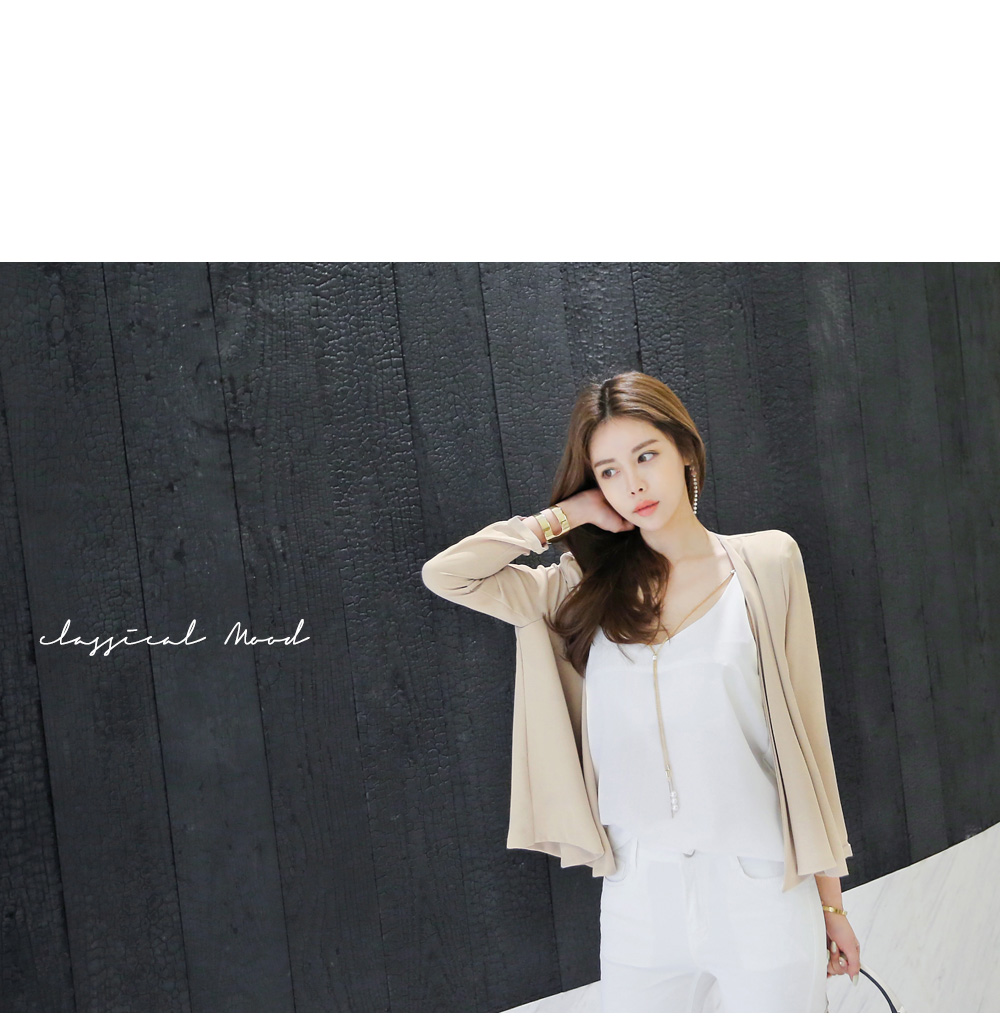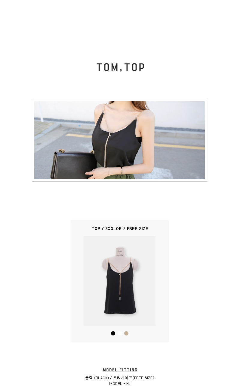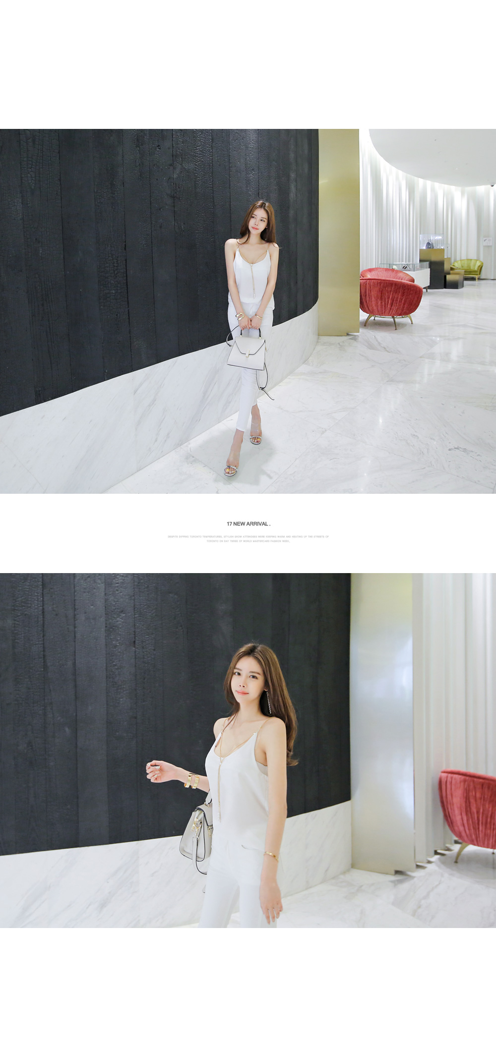 슬리브 디자인으로 숄더라인과 넥라인을 연결해주는 드롭되는 목걸이로