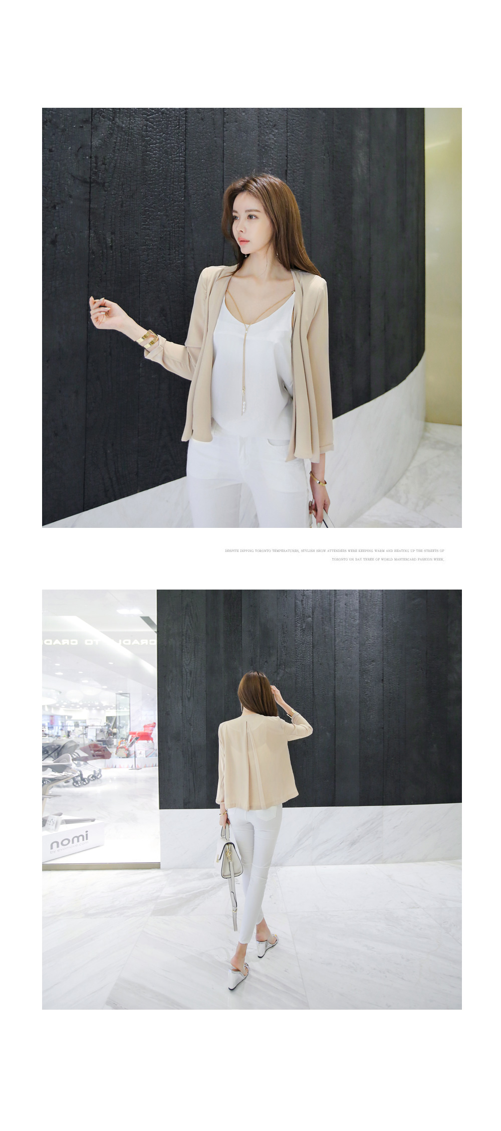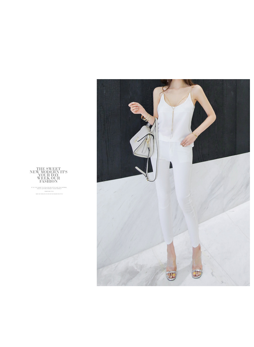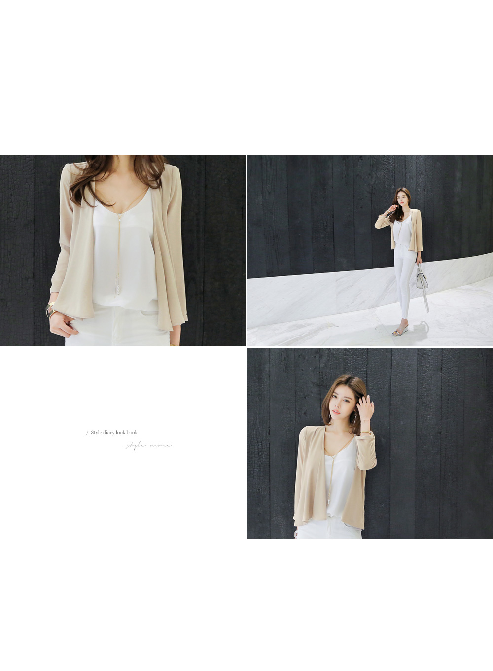 슬리브 디자인으로 숄더라인과 넥라인을 연결해주는 드롭되는 목걸이로