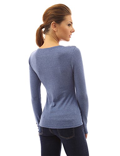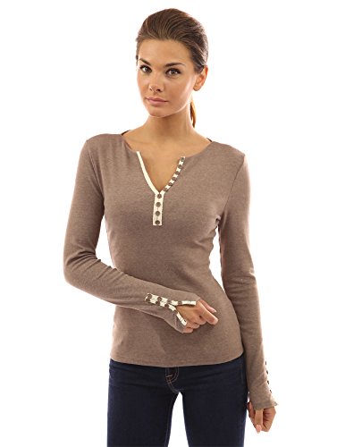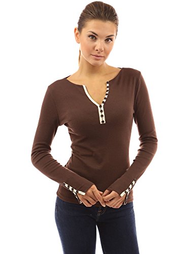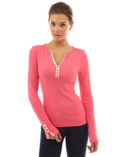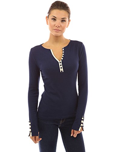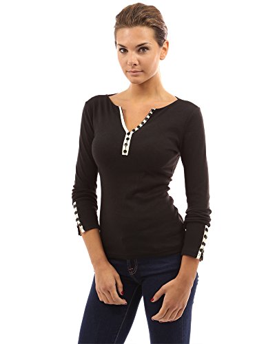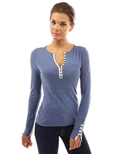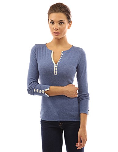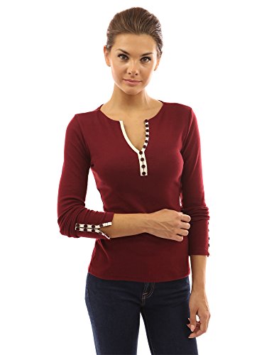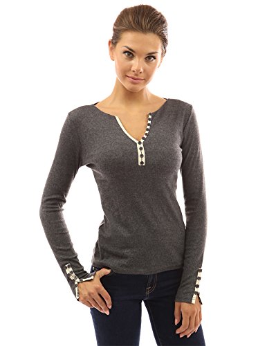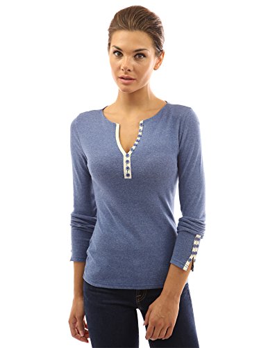 PattyBoutik Cotton Blend Textured Notch Neck Buttons Trim Long Sleeve Blouse Top. Model in pictures is 5 feet 8 inches (173cm) tall.