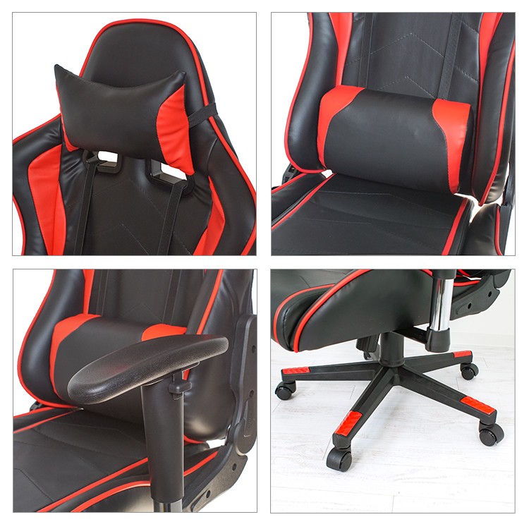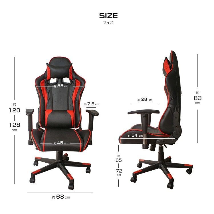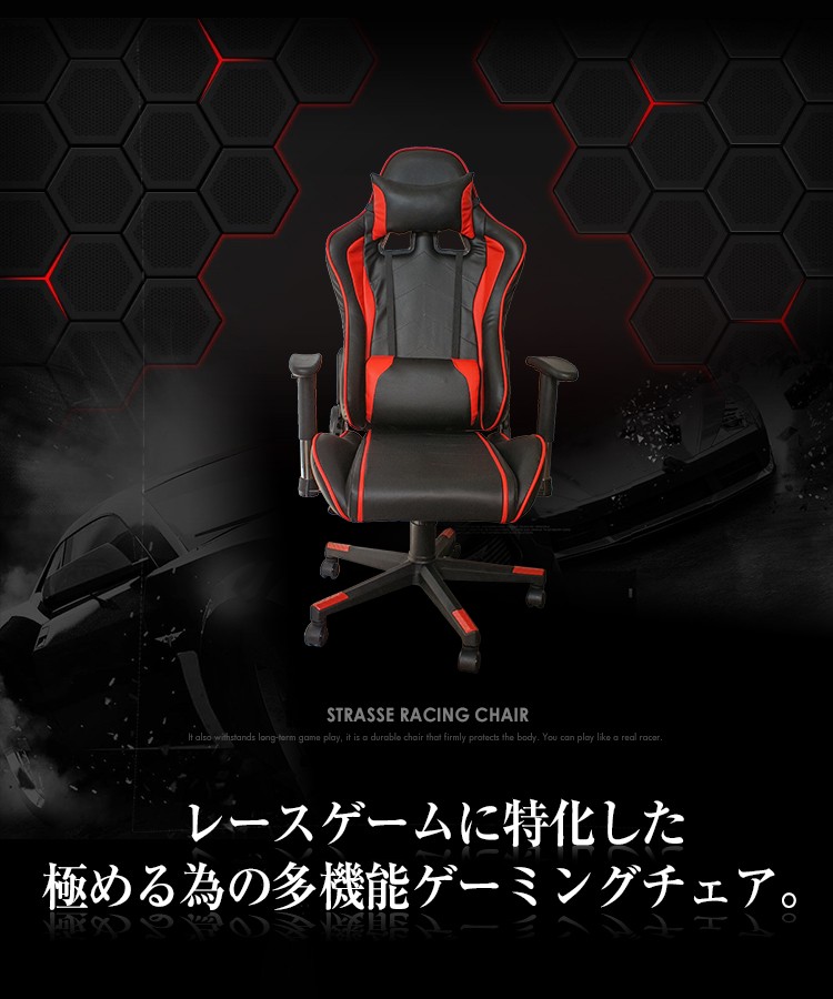 | 特徴 | レースゲーム用途に特化した本格レーシングチェア(ゲーミングチェア)です。 ヘッドクッション、ランバーサポート付きでしっかりと身体を支えてくれるので、長時間座っても疲れにくい仕様のため、オフィスチェアやパソコンチェアとしてはもちろん、ゲーミングチェアとして機能を発揮します。 約180度の無段階リクライニング機能でゆったりくつろぐことも可能。 高さ調整、角度調整可能なアームレスト、ロッキング機能と多機能モデル。 肌触りの良いレザー調の素材に、クッション性の高い座面で座り心地抜群です。 ※※こちらはレーシングチェア単品です。 |