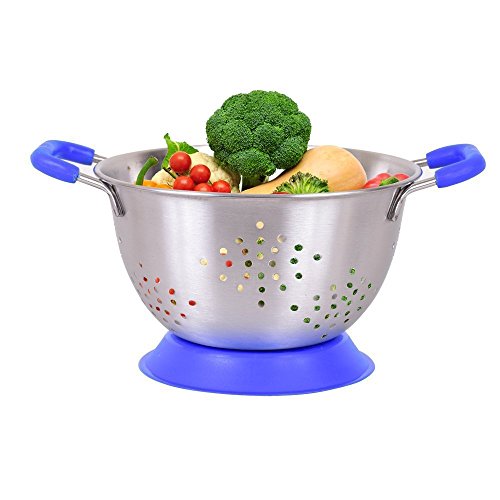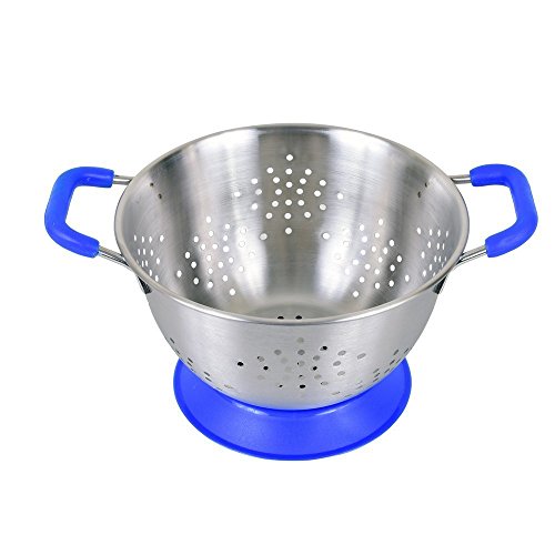 Kosma Kitchen Colander | Stainless Steel Twin Handled Deep Colander | Pasta Salad Fruit Food Strainer - Brushed Finish with Soft Cushioned Grip Non Skid Handles and Anti Skid Base - 20cm (Blue)