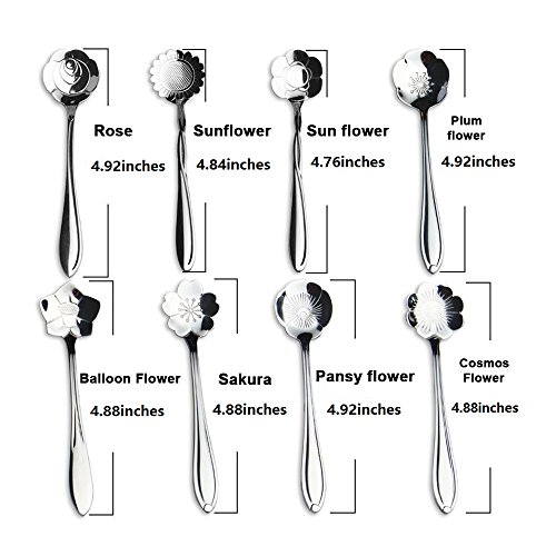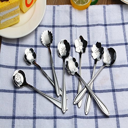 ERCRYSTO Stainless Steel Tableware Creative Flower Coffee Spoon, Stirring Spoon, Sugar Spoon, Stir Bar Spoon, Mixing Spoon, Tea Spoon, Ice Tea Spoon, Ice Cream Spoons,1 Set contain 8 Diffient Pattern