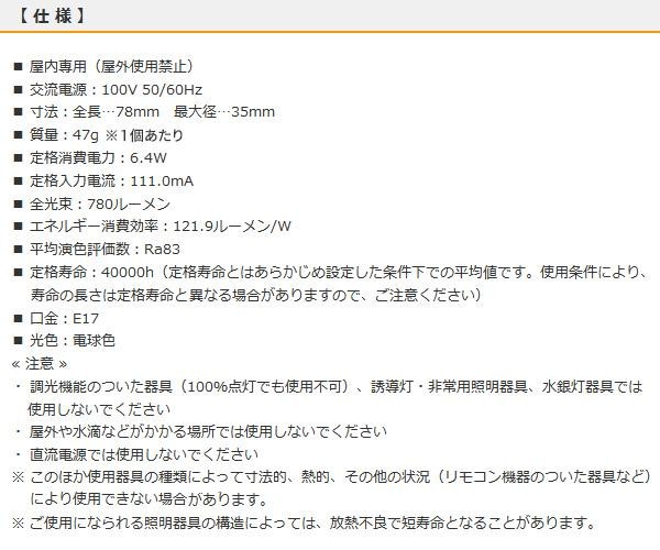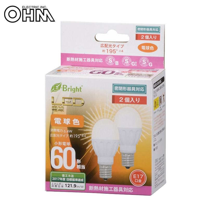小形電球60形相当の明るさ。密閉形器具/断熱材施工器具対応。光色は電球色で2個入りです。