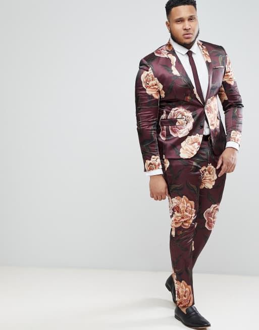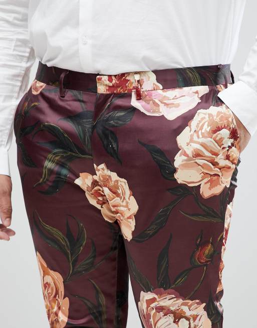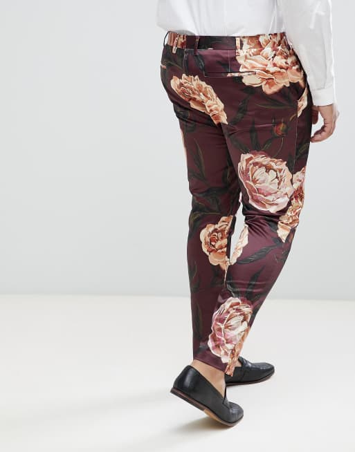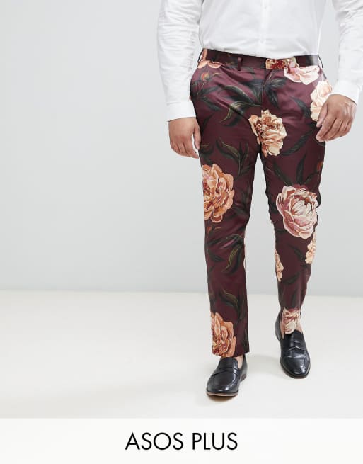 ASOS PLUS Super Skinny Suit Pants In Burgundy Floral Print