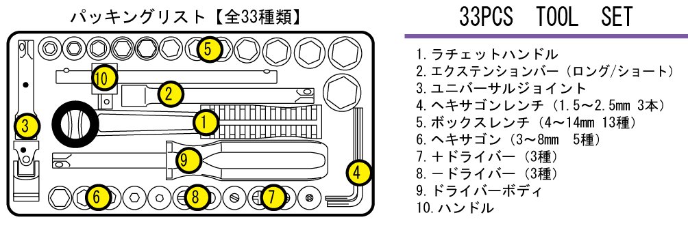 It is a tool set containing 33 kinds of general tools.