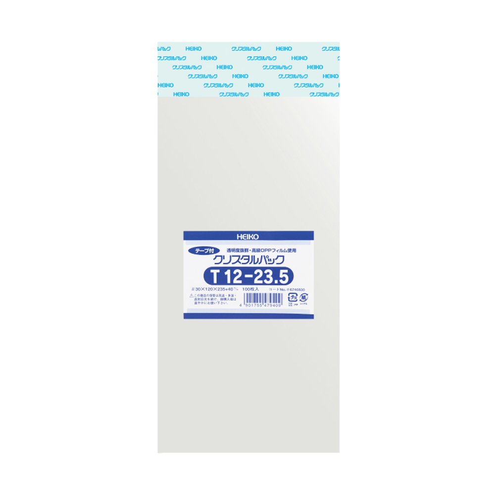 透明度と強度に優れたポリプロピレン製の「クリスタルパック」。 テープ付で封ができるタイプ。たっぷり使える大容量。 【サイズ】幅120×高さ235+テープ部分40mm 【入数】100枚 【材質】OPP0.03mm厚