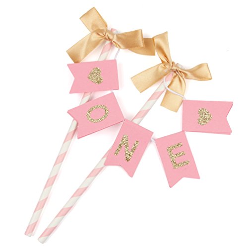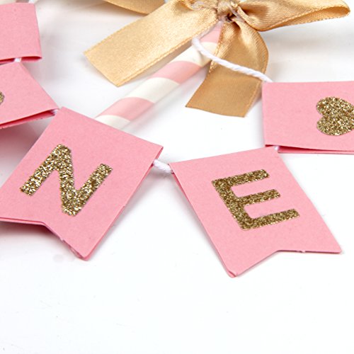 INNORU “ONE” Birthday Cake Topper - Handmade 1st First Birthday Pink and Gold Glitter Cake Bunting for Baby Girl Party Supplies