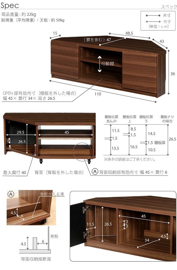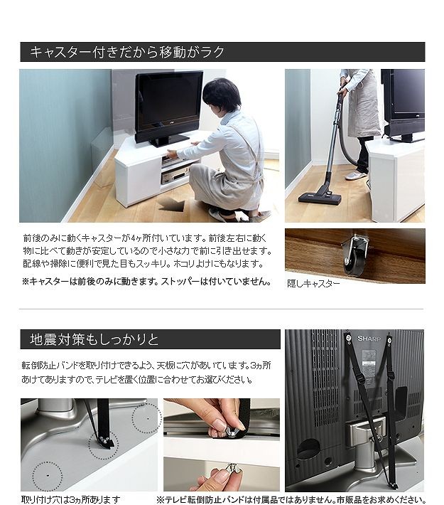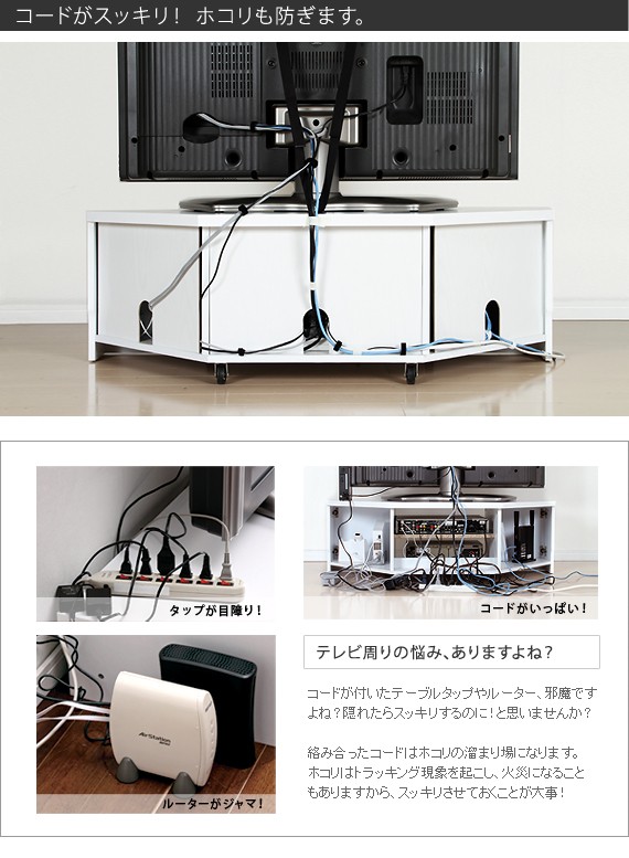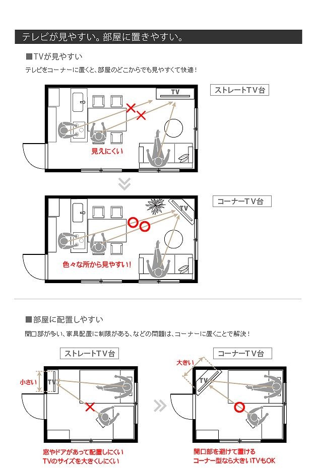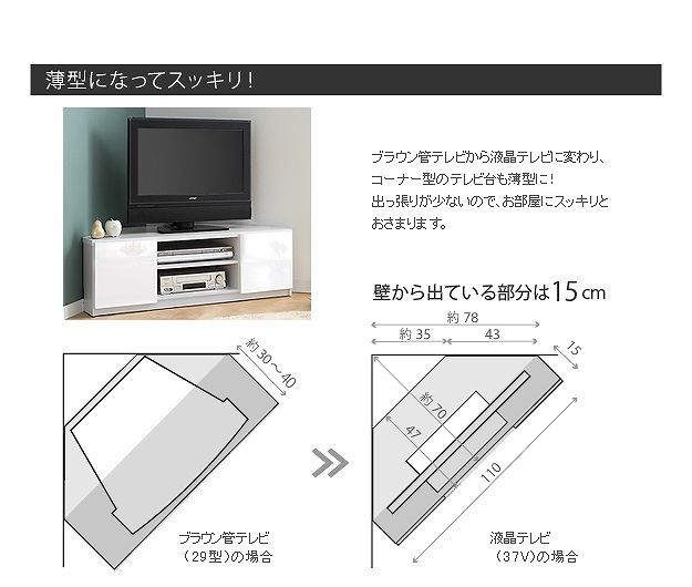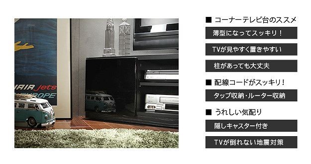 ●商品について:背面収納タイプのコーナーTVボード。テレビをコーナーに置くことで部屋のスペースを有効利用でき、部屋中どこからでも見やすい♪背面にテーブルタップを収納できるのでコード類の扱いも簡単☆前後に動くキャスター付きで配線作業、お掃除はラクラク。天板耐荷重50kg、テレビサイズ目安37V型まで