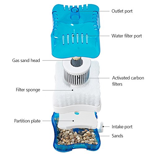 Sand can block lots of particles in the water, sponge can absorb large amounts of residual material, charcoal makes water more clear. Bubble stone blown fresh air will lead to clean water, giving your fish to create a healthy environment for the growth.