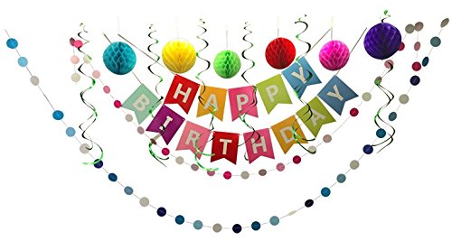 -. Feature : THIS PACKAGE INCLUDES: 1 Colorfull Happy Birthday banner, 6 paper Honeycomb balls of different colors that match the banner, 2 garlands in pink and blue shades and 6 green swirls. / PRE-STRUNG BANNER. Don't waste valuable time stringing your banner like with other similar birthday banners and party decorations. It's ready to be installed, the card stock pennant letters are pre-strung with satin ribbon. Each Gold foil letter is P.R.Inted on aprox. 8" x 6.5" inch glossy card board. Adjustable ribbon between each card board letter, not sewed. 2 separate strands "Happy" is approx. 3 feet long, "Birthday" is approx. 5 feet long. / GARLANDS. Each circles garland is aprox 3 meters long, 1 has pink shades and the other one blue shades made of card stock material. / HONEYCOMBS & SWIRL.This packages includes 6 paper honeycombs balls of different colors that match the banner and 6 green swirls / ADD TO CART NOW. Quality 100% guarantee or your money back. This is one of our best-selling birthday decorations. Joint our thousands of customers who rate our products FIVE STAR REVIEWS.